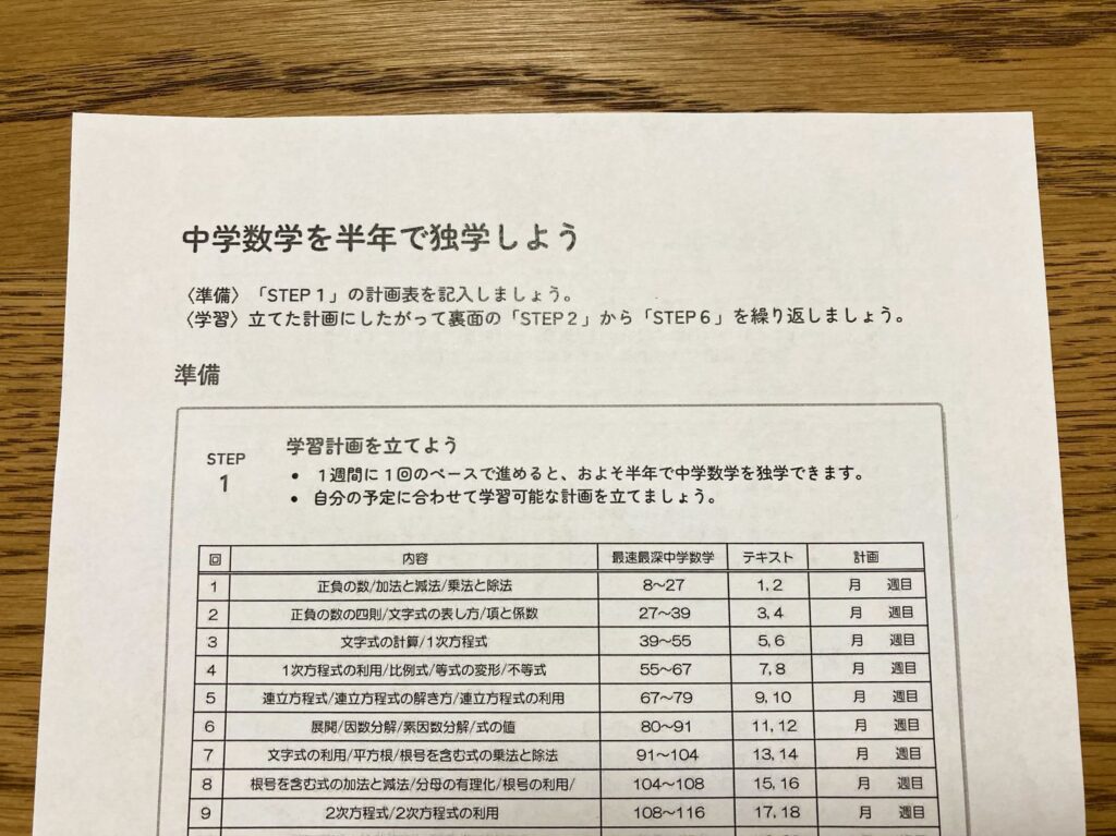 これに従って進めると、半年間で中学数学を学びきることができます。