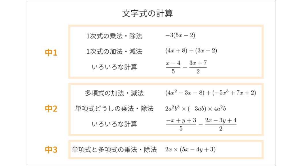 たとえば、文字式の計算については、次のように学年を分けて学習します。
