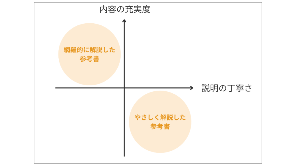 中学数学の参考書を下のグラフのように分類すると、ほとんどの参考書がグラフの左上か右下に位置します。